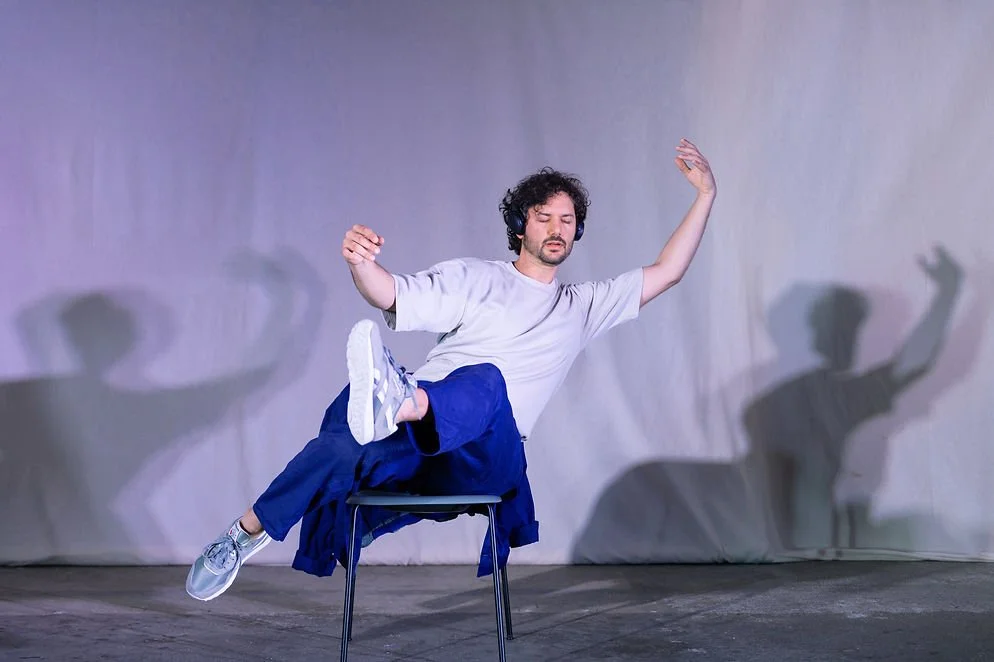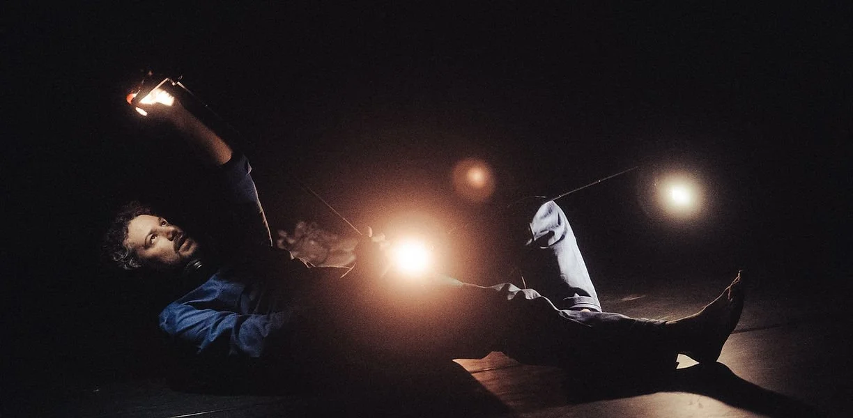 In a bare solo piece that combines text, sound, movement and object work Ari tries to understand where he is. By splitting and extending himself, he measures the various distances around and within him, tracing the delay between the sending of his messages and their arrival.